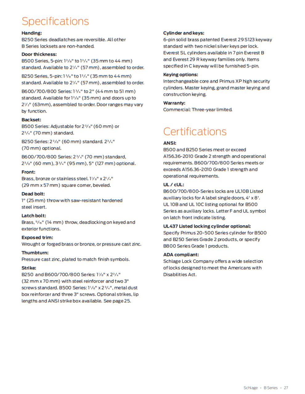 B600/700/800-Series locks are UL10B Listed auxiliary locks for A label single doors, 4' x 8'. UL 10B and UL 10C listing optional for B500 Series as auxiliary locks. Letter F and UL symbol on latch front indicate listing.