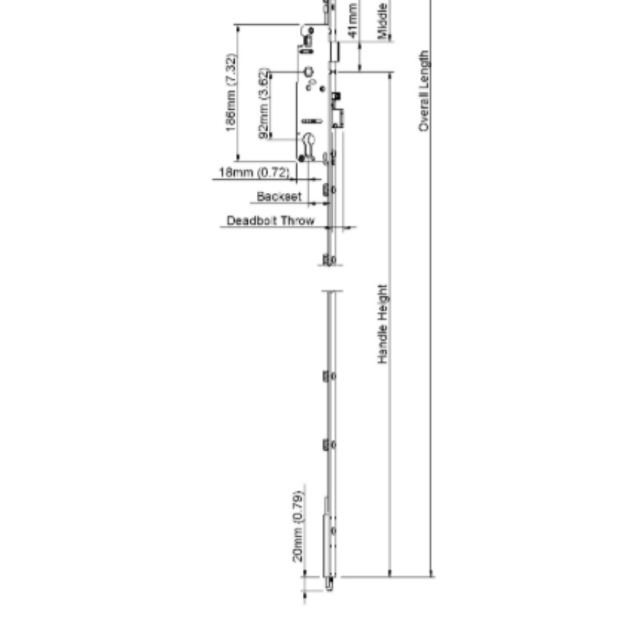 Manual active, 45 mm backset, 25.4 mm deadbolt throw 2 shootbolt 80" (2030 mm) 16 mm wide, square end 20 mm active and inactive.