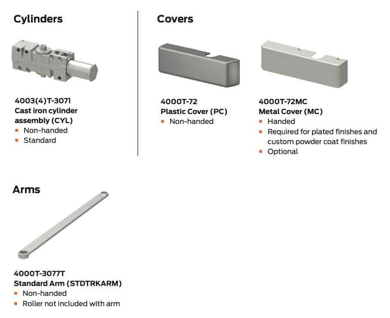 The 4000T Series mounts wall pocket mount on hinge pull side with a standard track Arm. Visit the 4000T Series catalog pages for mounting details and accessories.