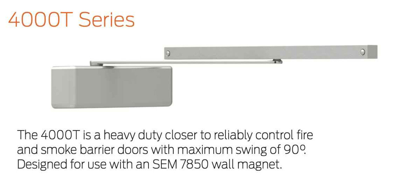 The 4000T is a Heavy Duty Closer to reliably control fire and smoke barrier doors with maximum swing of 90. Designed for use with an SEM 7850 wall magnet.