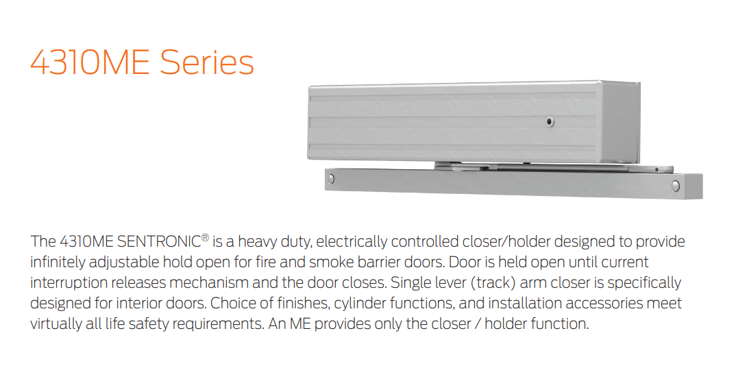 The 4310ME Sentronic is a Heavy Duty, electrically controlled Closer/holder designed to provide infinitely adjustable hold-open for fire and smoke barrier doors. Door is held open until current interruption releases mechanism and the Door closes. Single Lever (track) Arm Closer is specifically designed for Interior doors. Choice of finishes, cylinder functions, and installation accessories meet virtually all life safety requirements. An ME provides only the Closer / Holder function.