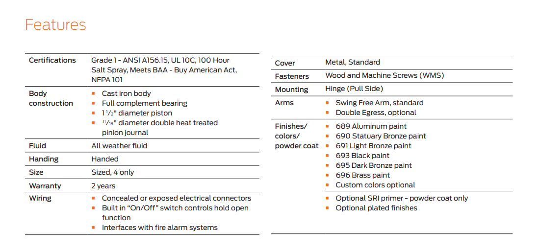 The 2310ME, 4310ME and 4410ME Sentronic Closers provide adjustable hold-open points for fire and smoke barrier doors. The Closers are UL listed for metal smoke barriers or labelled fire doors. They also meet ANSI/BHMA A156.15 and NFPA 101 Life Safety Code standards. Each Closer is backed by a 2-year limited warranty, offers optional plated finishes and integrates with existing fire and life safety systems, minimizing danger to life and property under fire conditions.