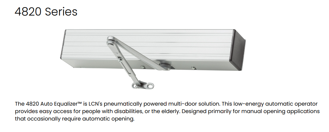The 4820 Auto Equalizer™ is LCN’s pneumatically powered multi-door solution. This low-energy automatic operator provides easy access for people with disabilities, or the elderly. Designed primarily for manual opening applications that occasionally require automatic opening.