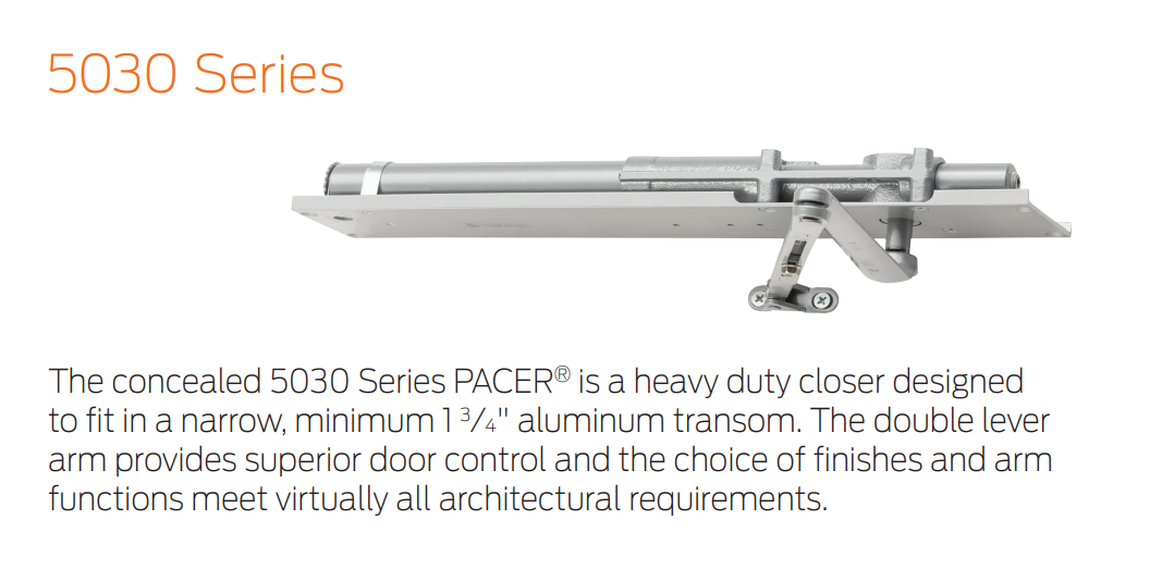 The Concealed 5030 Series Pacer is a Heavy Duty Closer designed to fit in a narrow, minimum 1-3/4" aluminum transom. The Double lever Arm provides superior Door control and the choice of finishes and Arm functions meet virtually all architectural requirements.