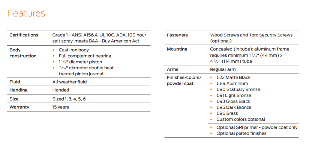 Materials for all three Series include a cast iron cylinder; a one-piece forged steel piston; a high-efficiency, full-complement, low-friction bearing; tamper-resistant regulating screw and all-weather fluid. Optional plated finishes accent the Arm, fasteners and finish plate for all three Series.
