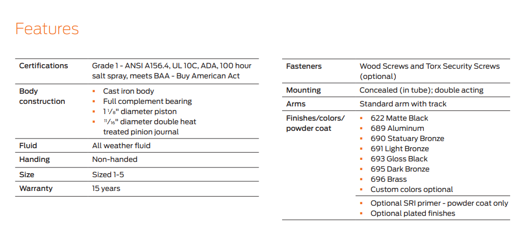 Materials for all three Series include a cast iron cylinder; a one-piece forged steel piston; a high-efficiency, full-complement, low-friction bearing; tamper-resistant regulating screw and all-weather fluid. Optional plated finishes accent the Arm, fasteners and finish plate for all three Series.