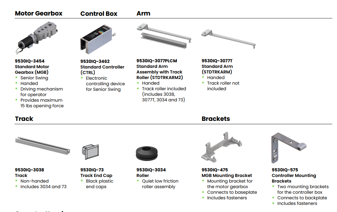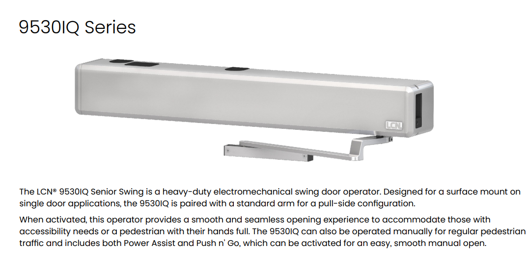 The LCN® 9530IQ Senior Swing is a heavy-duty electromechanical swing door operator. Designed for a surface mount on single door applications, the 9530IQ is paired with a standard arm for a pull-side configuration. When activated, this operator provides a smooth and seamless opening experience to accommodate those with accessibility needs or a pedestrian with their hands full. The 9530IQ can also be operated manually for regular pedestrian traffic and includes both Power Assist and Push n’ Go, which can be activated for an easy, smooth manual open.