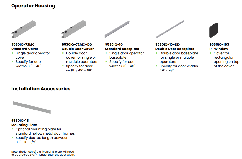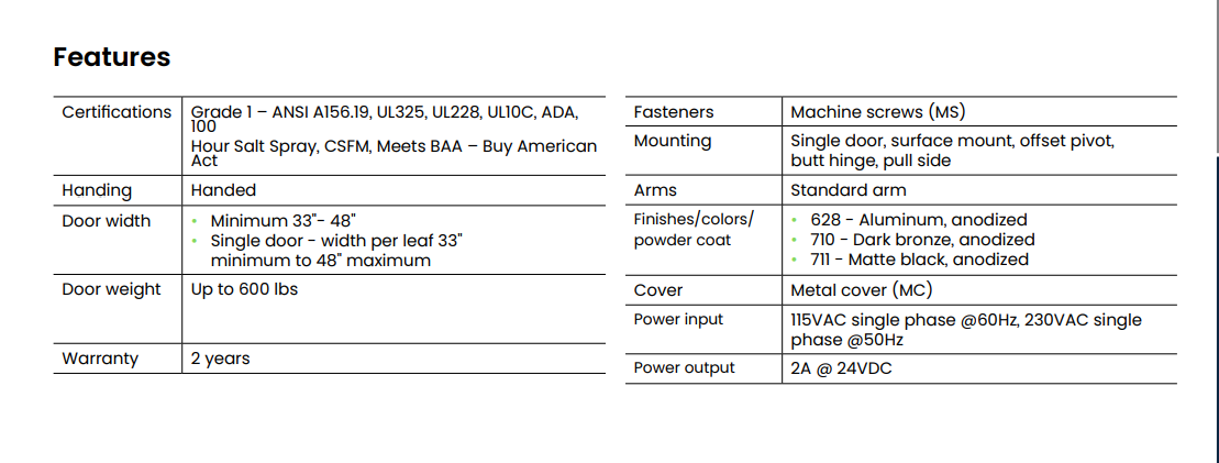 • Capability to operate and control doors of up to 600 pounds