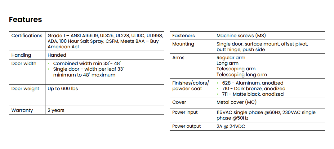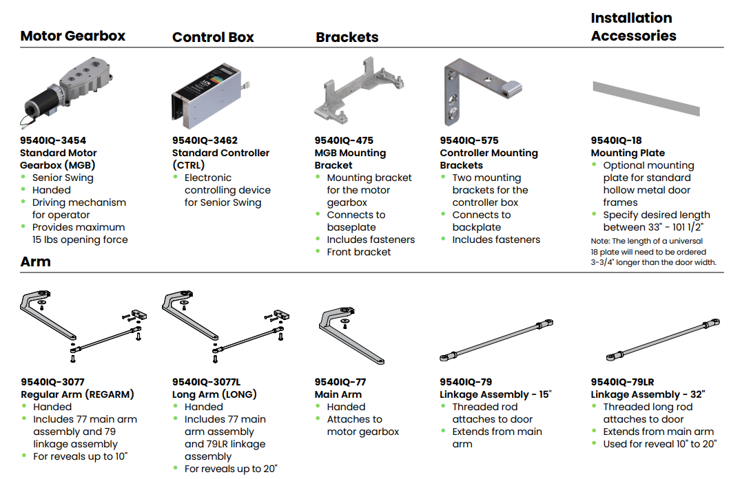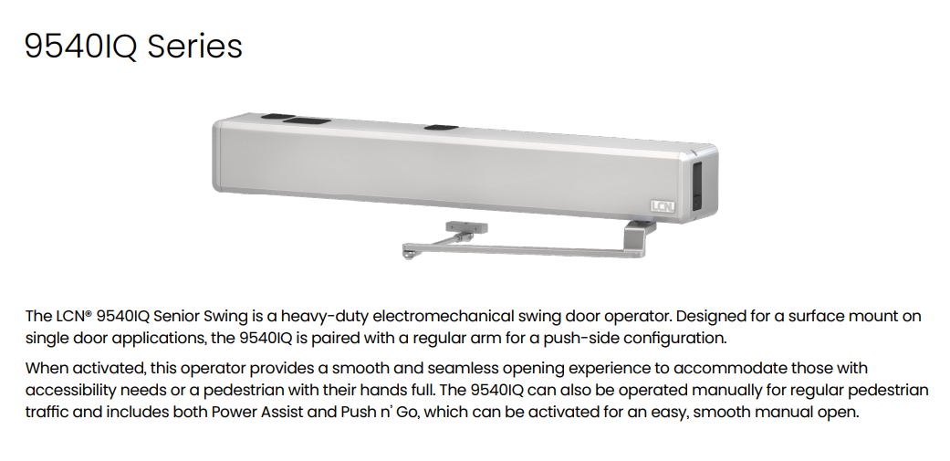 The LCN® 9540IQ Senior Swing is a heavy-duty electromechanical swing door operator. Designed for a surface mount on single door applications, the 9540IQ is paired with a regular arm for a push-side configuration. When activated, this operator provides a smooth and seamless opening experience to accommodate those with accessibility needs or a pedestrian with their hands full. The 9540IQ can also be operated manually for regular pedestrian traffic and includes both Power Assist and Push n’ Go, which can be activated for an easy, smooth manual open.