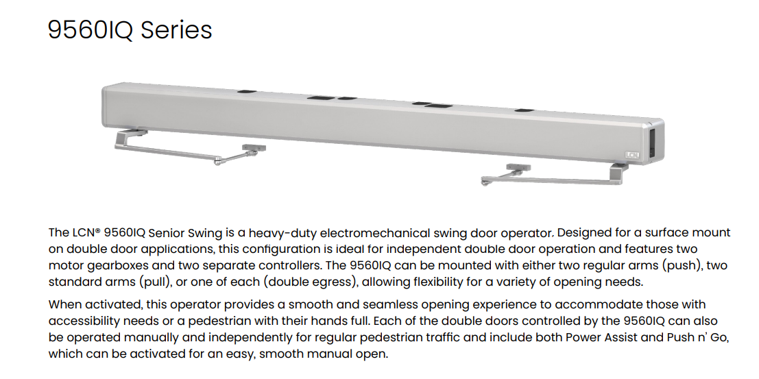 The LCN® 9560IQ Senior Swing is a heavy-duty electromechanical swing door operator. Designed for a surface mount on double door applications, this configuration is ideal for independent double door operation and features two motor gearboxes and two separate controllers. The 9560IQ can be mounted with either two regular arms (push), two