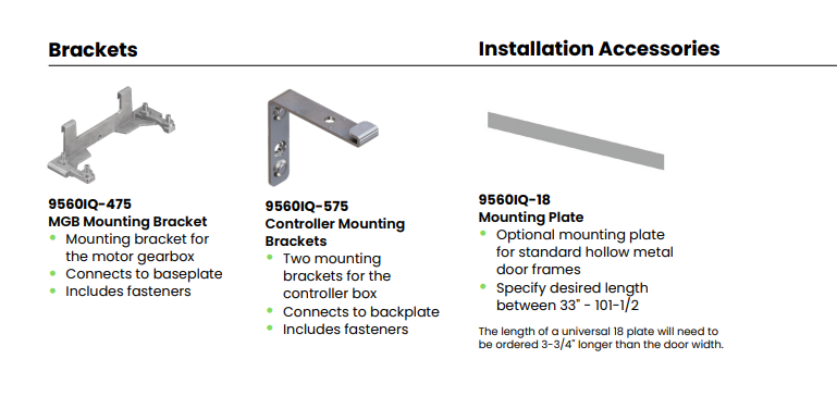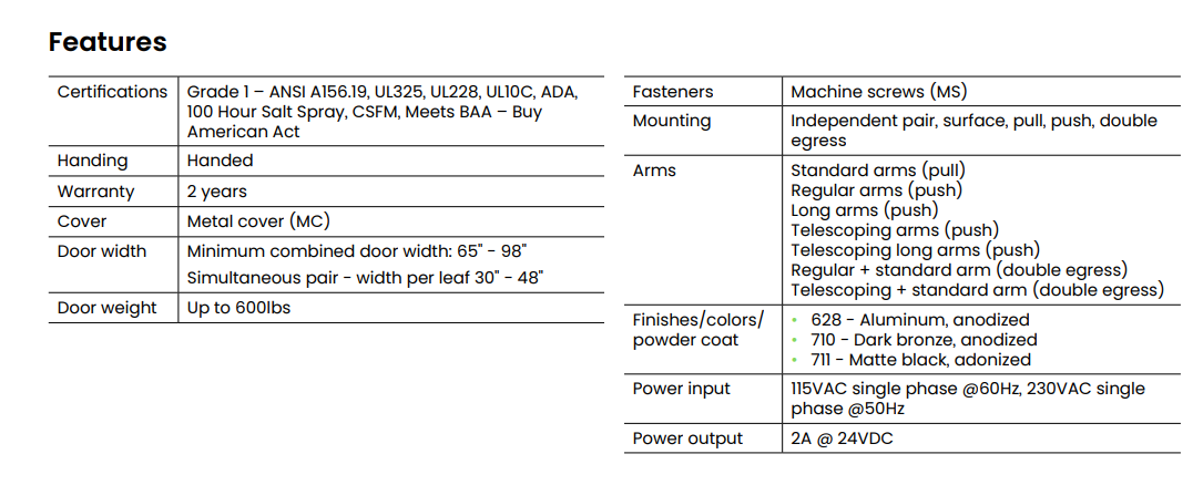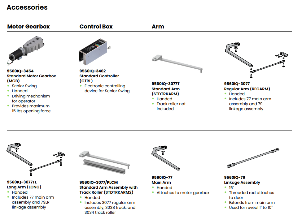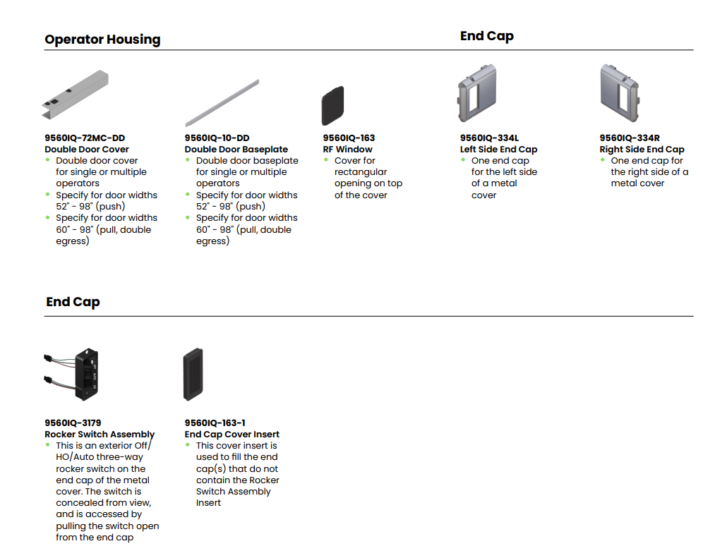 standard arms (pull), or one of each (double egress), allowing flexibility for a variety of opening needs. When activated, this operator provides a smooth and seamless opening experience to accommodate those with accessibility needs or a pedestrian with their hands full. Each of the double doors controlled by the 9560IQ can also be operated manually and independently for regular pedestrian traffic and include both Power Assist and Push n’ Go,