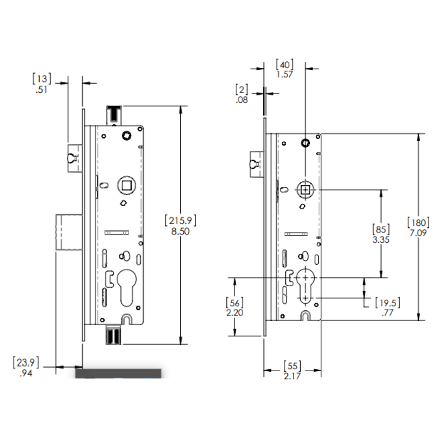 Interlock Optimum hinged door 4 point mortise lock with 40mm backset. Used by many aluminum door manufacturers, and to replace damaged or missing mortise lock in hinged doors. When deadbolt is extended the spring latch becomes rigid and creates another locking point.