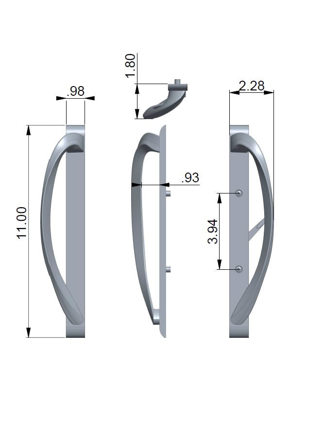 The Rockwell Modena handles are 10″ inches long, have a compounded curve that creates a flat surface to rest your hands when you pull on the sliding door handle.