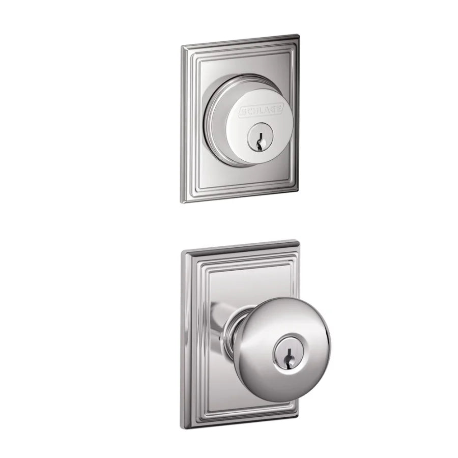 Schlage Plymouth Single Cylinder Keyed Entry Door Knob Set and Addison Deadbolt Combo with Addison Rose