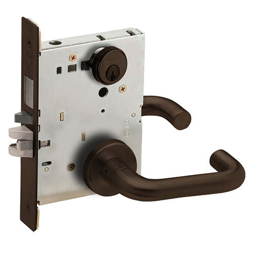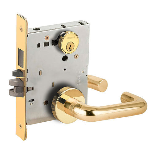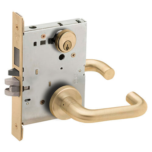 ANSI F20 – Entrance – Latchbolt retracted by lever from either side unless outside is locked by 20° rotation of thumbturn. Deadbolt thrown or retracted by 90° rotation of thumbturn. When locked, key outside or lever inside retracts deadbolt and latchbolt simultaneously. Outside lever remains locked until thumbturn is restored to vertical position. Throwing deadbolt automatically locks outside lever. Auxiliary latch deadlocks latchbolt when door is closed. Inside lever is always free for immediate egress.