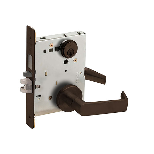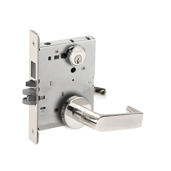 ANSI F20 – Entrance – Latchbolt retracted by lever from either side unless outside is locked by 20° rotation of thumbturn. Deadbolt thrown or retracted by 90° rotation of thumbturn. When locked, key outside or lever inside retracts deadbolt and latchbolt simultaneously. Outside lever remains locked until thumbturn is restored to vertical position. Throwing deadbolt automatically locks outside lever. Auxiliary latch deadlocks latchbolt when door is closed. Inside lever is always free for immediate egress.