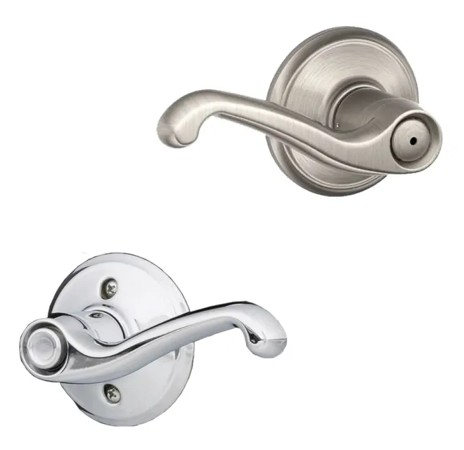 Privacy Function: Privacy door hardware features a push-button locking mechanism on the interior for use on bedroom and bathroom doors where locking is needed. The exterior side features a small pin hole to unlock the door hardware from the outside.