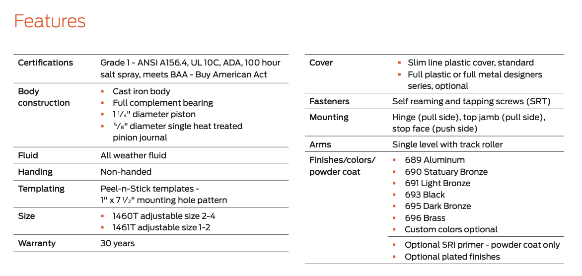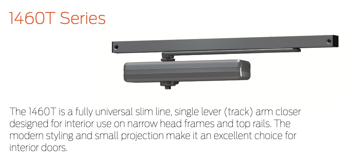 The 1460 Series is a universal medium-duty closer designed for maximum versatility in commercial and institutional applications, meeting ANSI/BHMA A156.4 Grade 1 and ADA reduced-opening-force requirements.