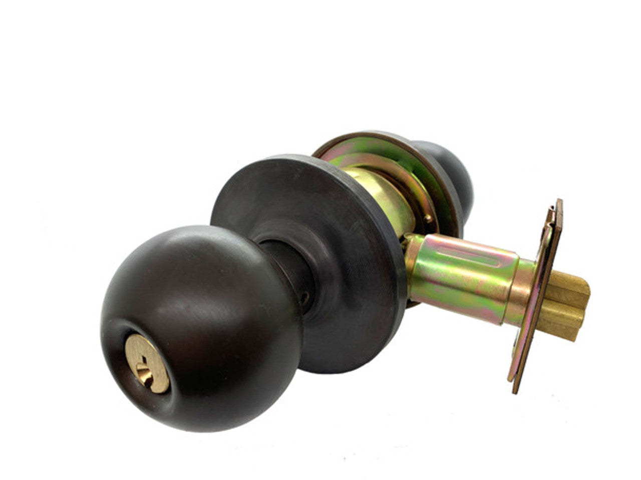 Deadlocking latch bolt operated by key in outside knob or by rotating inside knob. Outside knob is always fixed.