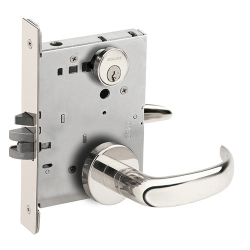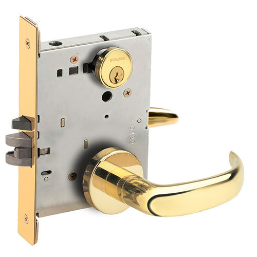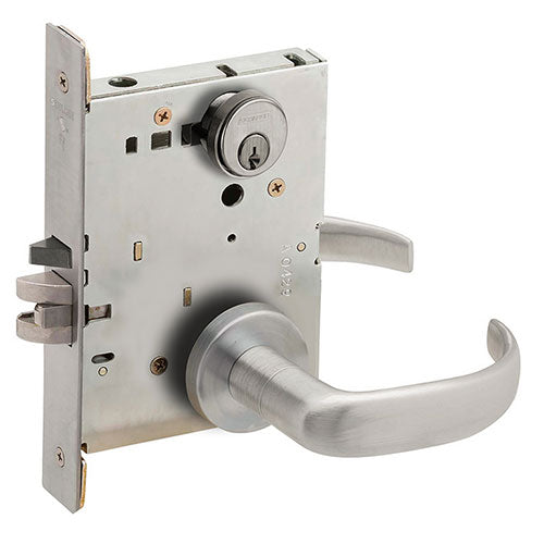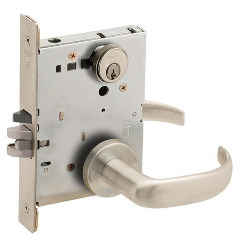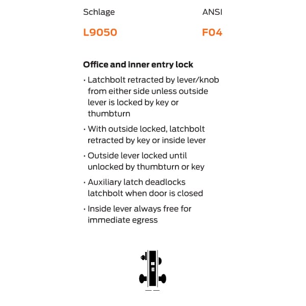 ANSI F04 – Office/Entry – Latchbolt retracted by lever from either side unless outside is made inoperative by key outside or by turning inside thumbturn. When outside is locked, latchbolt is retracted by key outside or by lever inside. Outside lever remains locked until thumbturn is returned to vertical or unlocked by key. Auxiliary latch deadlocks latchbolt when door is closed. Inside liner is always free for immediate egress.