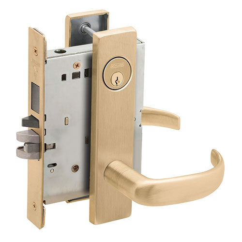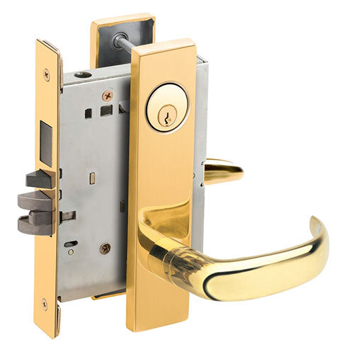 ANSI F20 – Entrance – Latchbolt retracted by lever from either side unless outside is locked by 20° rotation of thumbturn. Deadbolt thrown or retracted by 90° rotation of thumbturn. When locked, key outside or lever inside retracts deadbolt and latchbolt simultaneously. Outside lever remains locked until thumbturn is restored to vertical position. Throwing deadbolt automatically locks outside lever. Auxiliary latch deadlocks latchbolt when door is closed. Inside lever is always free for immediate egress.