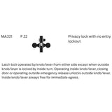 ANSI F22 – Privacy Mortise Lock – Latch bolt operated by knob/lever from either side except when outside knob/lever is locked by inside turn. Operating inside knob/lever, closing door or operating outside emergency release unlocks outside knob/lever. Inside knob/lever always free for immediate egress.